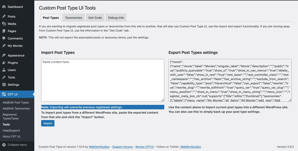 В полето „Import Post Types“ копирайте и поставете кода: